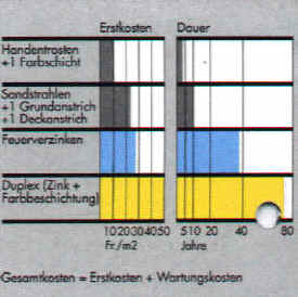 Der überzeugenste Vorteil der Feuerverzinkung heisst Wirtschaftlichkeit. Das Preis-/Leistungsverhältnis ist allen anderen Korrosionsschutzsystemen bei weitem überlegen. Wirtschaftlichkeit bedeutet mehr als nur die Preise für einen Erstschutz miteinander zu vergleichen. Obwohl auch da Feuerverzinken den Vergleich mit Anstrichsystemen nicht zu scheuen braucht! Aber erst die Gesamtkosten, d. h. die Erst- und Wartungskosten im Verhältnis zur Schutzdauer zeigen, wie wirtschaftlich Feuerverzinken wirklich ist.Weltweit werden jährlich mehr als 25 Millionen Tonnen Stahl durch Feuerverzinkung vor Korrosion geschützt. Allein in der Schweiz sind es jedes Jahr mehr als 100'000 Tonnen, dies entspricht dem Gewicht von 2'200 vollbeladenen Eisenbahnwagen..