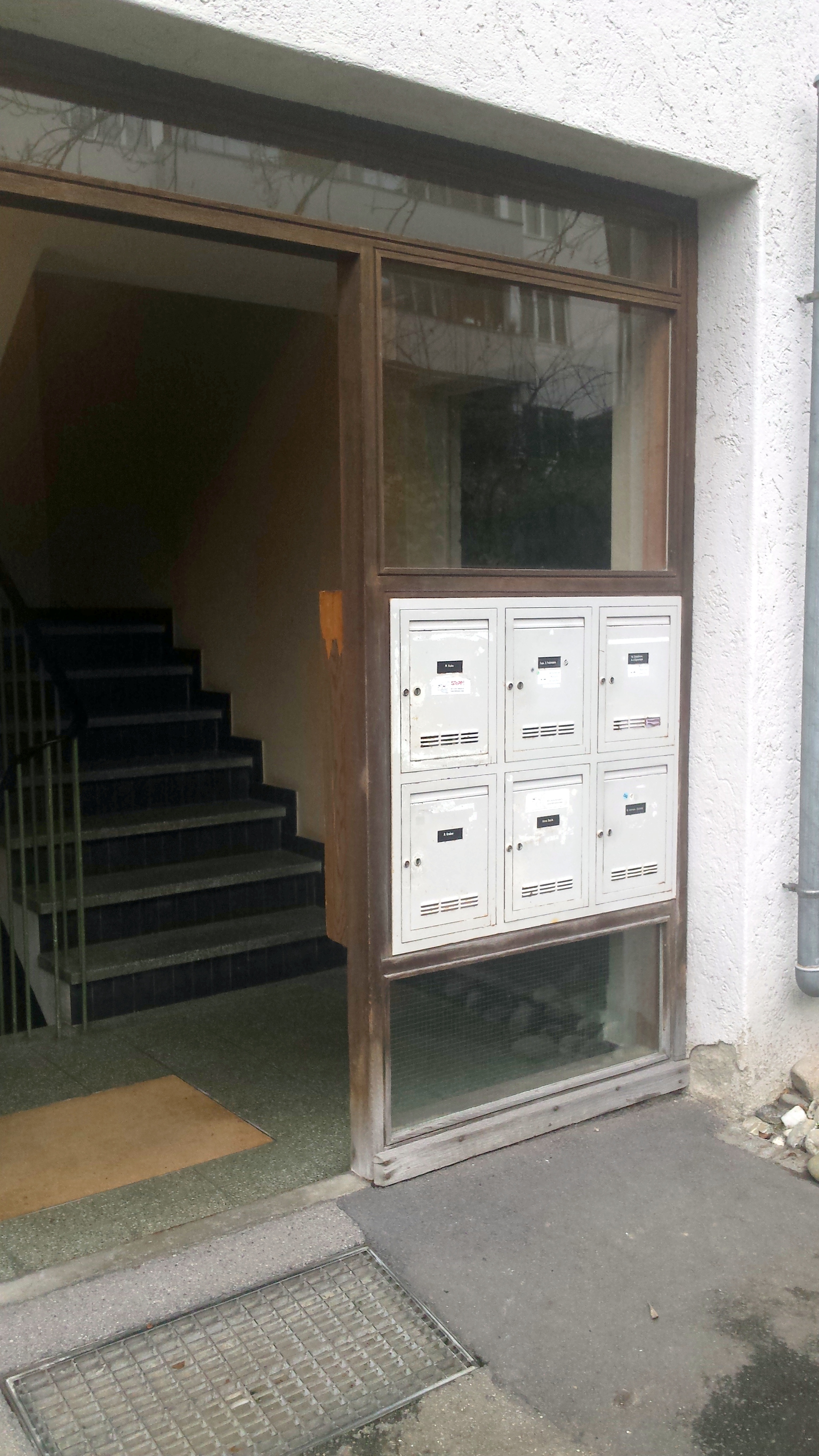 Um den Briefkasten im Trockenen leeren zu können, wurde die Türfront mit einem abgerundeten Acryl-Glasdach abgedeckt. Es besteht aus vier Schwertern aus geschliffenem Edelstahl mit Löchern. Vorne hat es einen Wasserkanal mit Tropfnase und hinten zur Wand ist es mit einem Anschlussprofil und einer Silikonfuge abgedichtet.